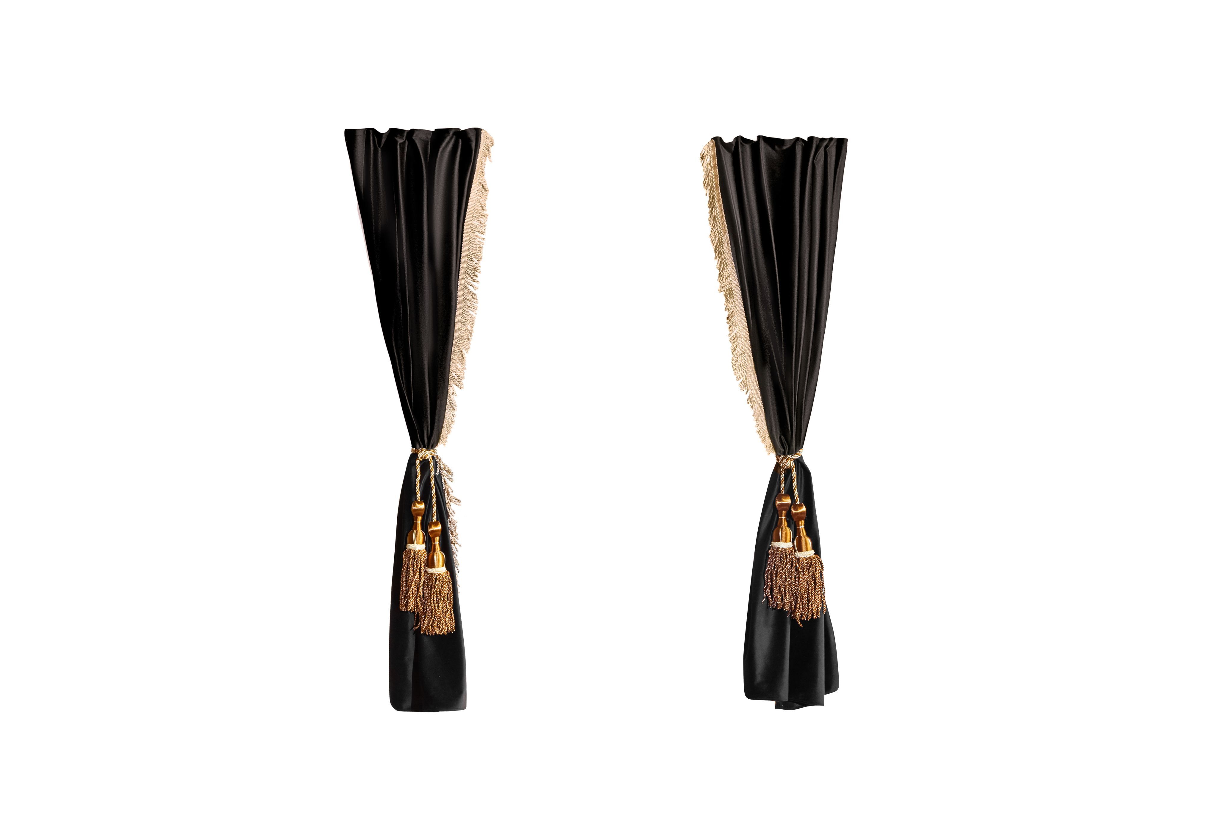 Изготовлены из качественного двойного велюра, шторы обладают свойствами блэкаут, что обеспечивает надежную защиту от солнечных лучей и лишних взглядов. Черный цвет с роскошной золотой бахромой придаёт вашим шторкам стильный и элегантный вид, отлично сочетаясь с любым интерьером.