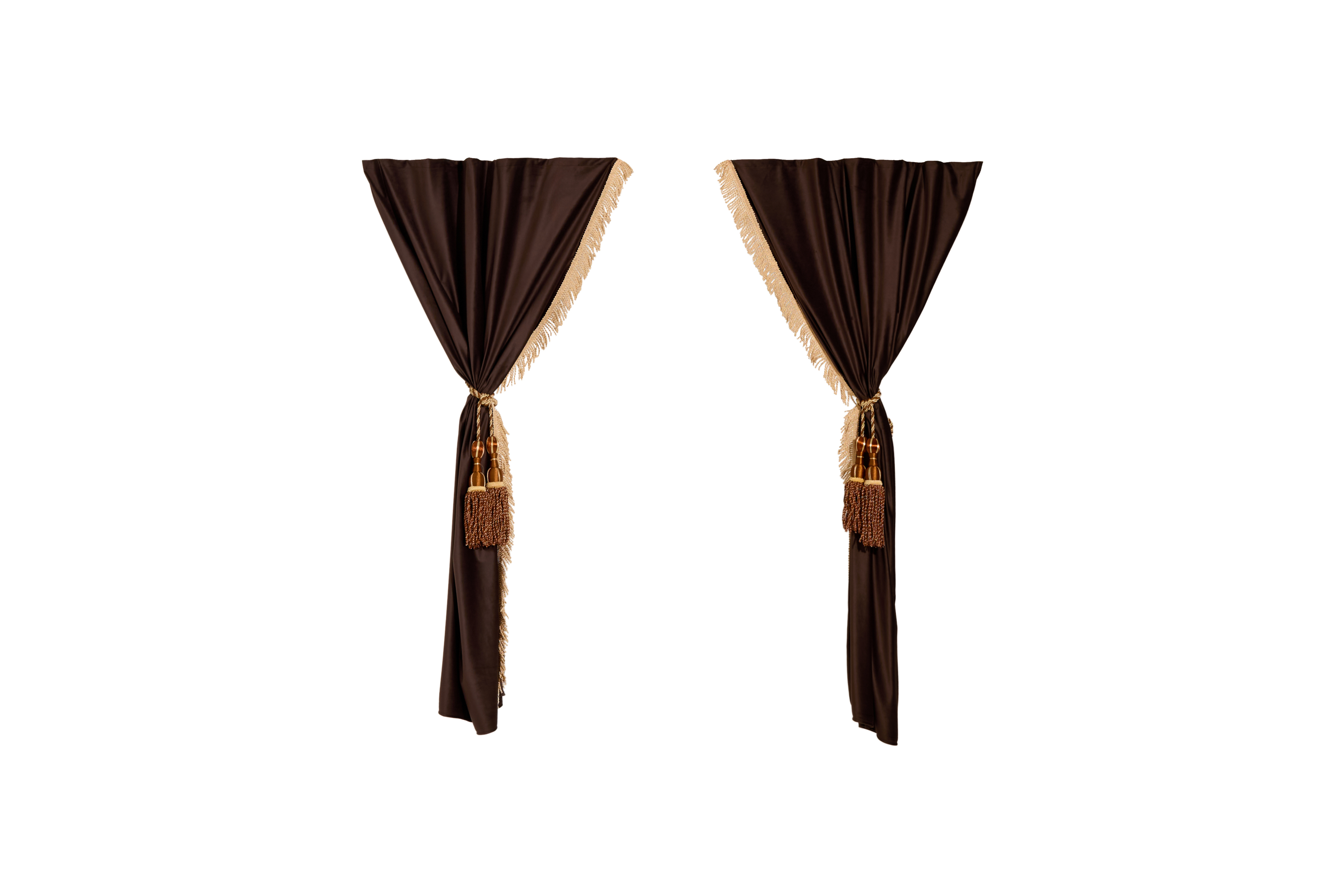 Шторы спального места с прихватами "Кисти" коричневые в кабину Volvo, Scania, MAN, DAF, Merc, Камаз, Sitrak, Shacman, Foton, FAW. Высота 1,5м, ширина одной стороны - 1,15м. Блэкаут, велюр. Коричневый цвет с бежевой бахромой и коричневыми кистями