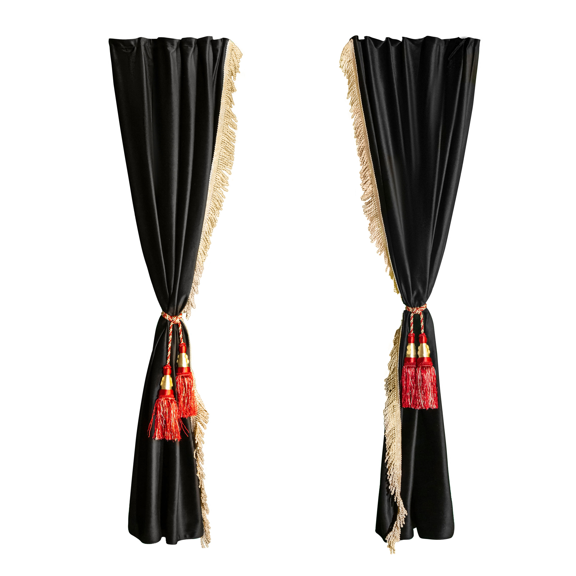 Изготовлены из качественного двойного велюра, шторы обладают свойствами блэкаут, что обеспечивает надежную защиту от солнечных лучей и лишних взглядов. Черный цвет с роскошной золотой бахромой придаёт вашим шторкам стильный и элегантный вид, отлично сочетаясь с любым интерьером.