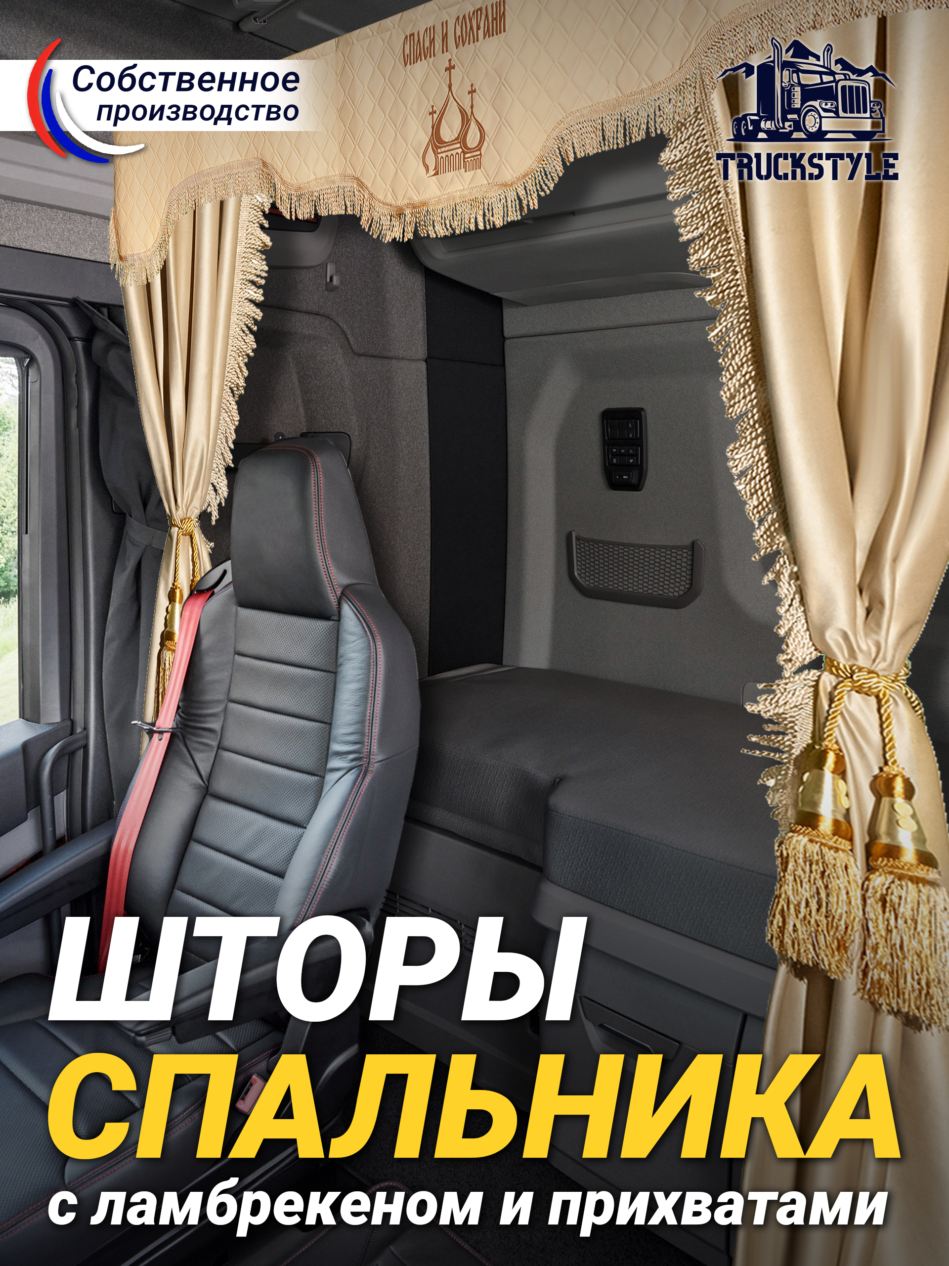 Шторы спального места с прихватами в кабину грузовика. Ламбрекен из экокожи с вышивкой Спаси и Сохрани и прихватами "Кисти". Высота 1,5м, ширина одной стороны - 1,15м. Блэкаут, велюр. Бежевый цвет с золотыми кистями