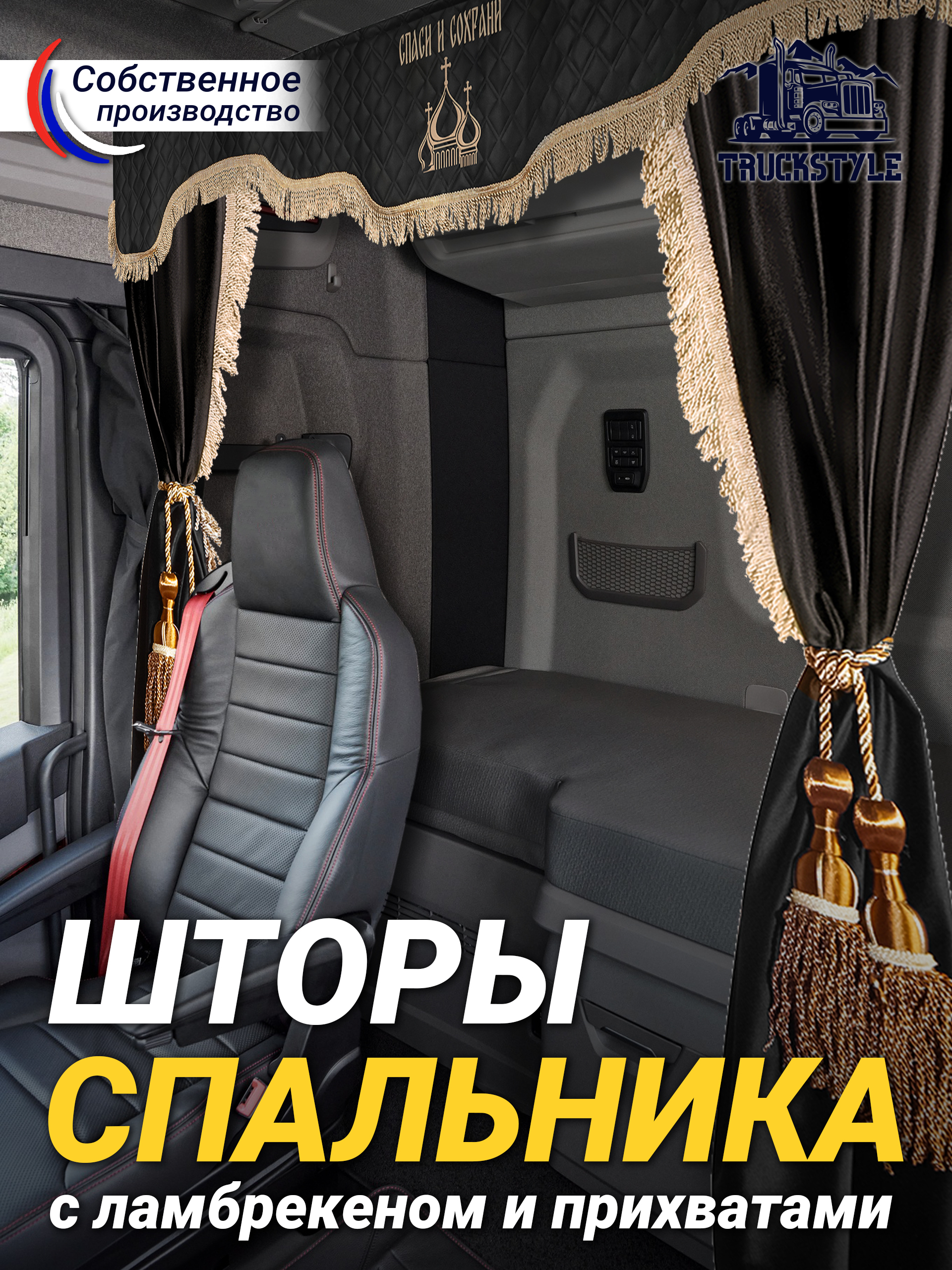 Шторы спального места с прихватами в кабину грузовика. Ламбрекен из экокожи с вышивкой Спаси и Сохрани и прихватами "Кисти". Высота 1,5м, ширина одной стороны - 1,15м. Блэкаут, велюр. Черный цвет с коричневыми кистями