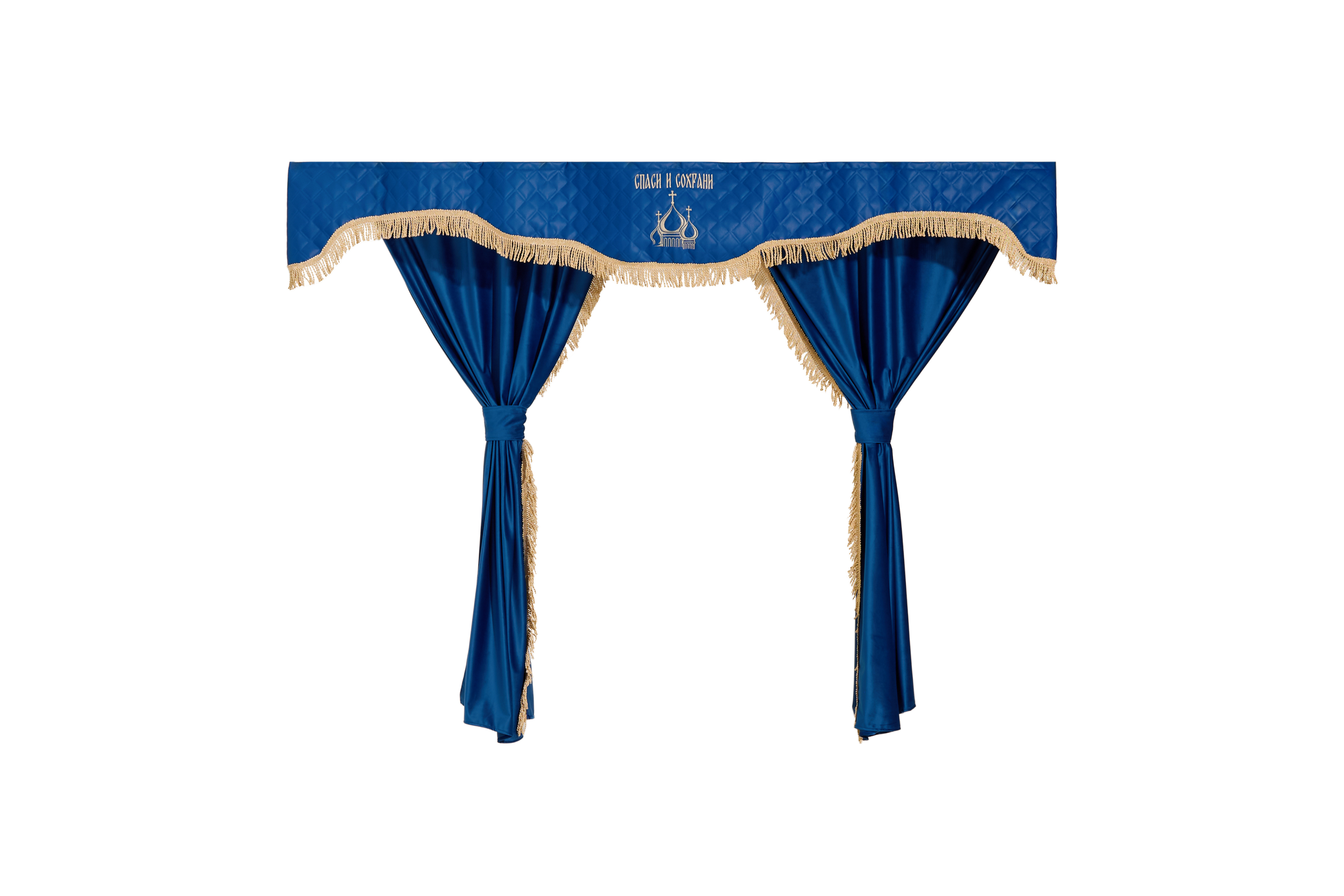 Шторы спального места с прихватами в кабину грузовика. Ламбрекен из экокожи с вышивкой Спаси и Сохрани и прихватами. Высота 1,5м, ширина одной стороны - 1,15м. Блэкаут, велюр. Синий цвет с бежевой бахромой