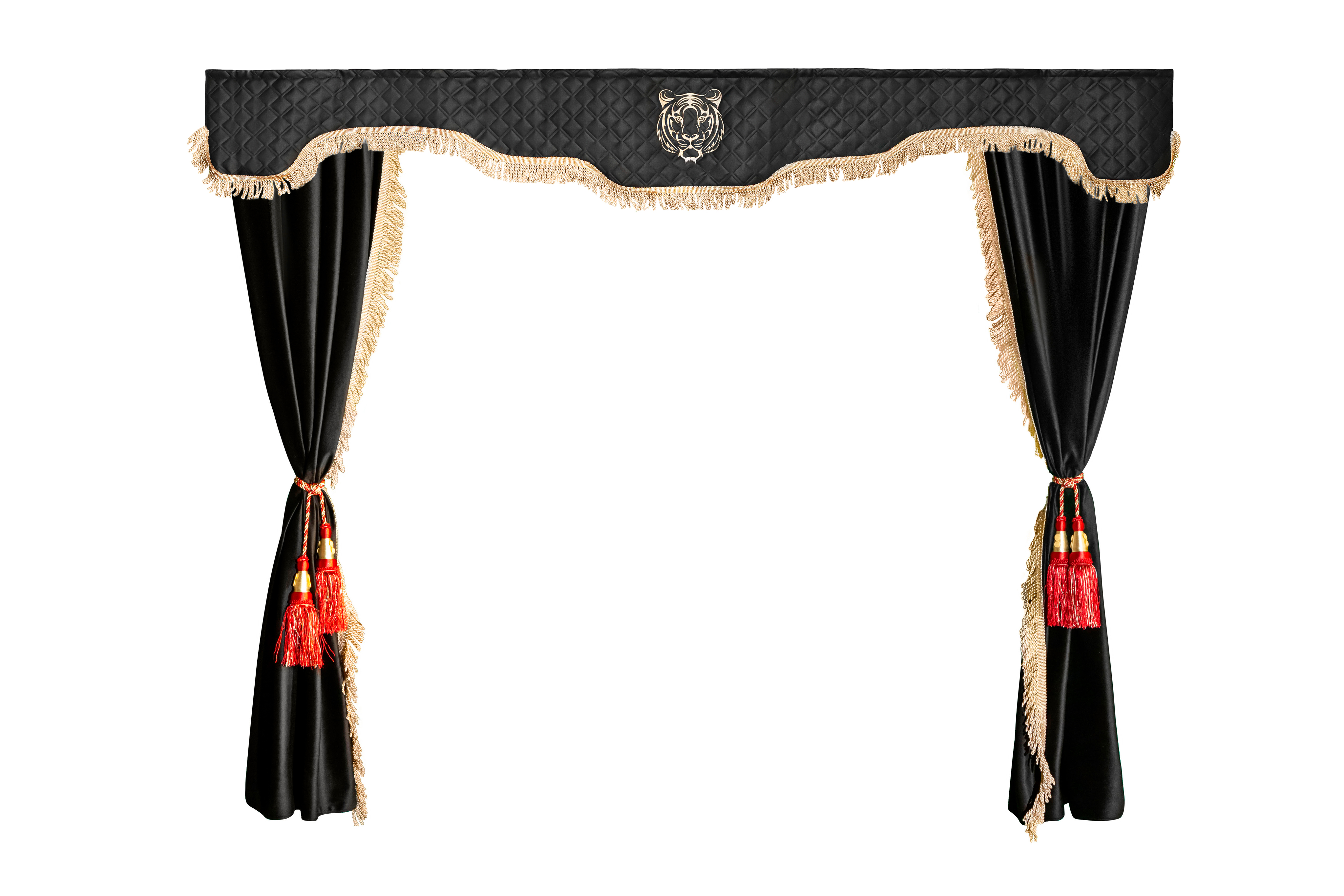 Шторы спального места с прихватами в кабину грузовика. Ламбрекен из экокожи с вышивкой Тигр и прихватами "Кисти". Высота 1,5м, ширина одной стороны - 1,15м. Блэкаут, велюр. Черный цвет с красными кистями