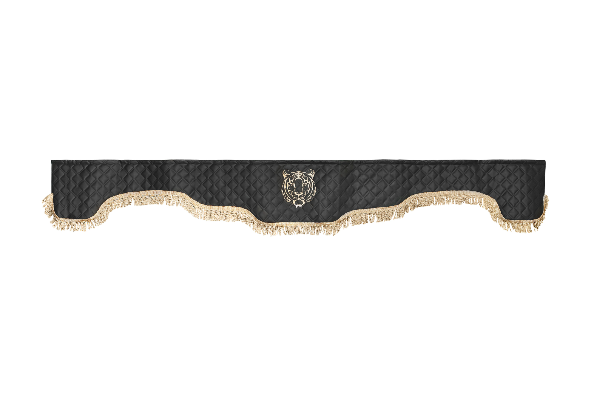 Шторы спального места с прихватами в кабину грузовика. Ламбрекен из экокожи с вышивкой Тигр и прихватами "Кисти". Высота 1,5м, ширина одной стороны - 1,15м. Блэкаут, велюр. Черный цвет с золотыми кистями