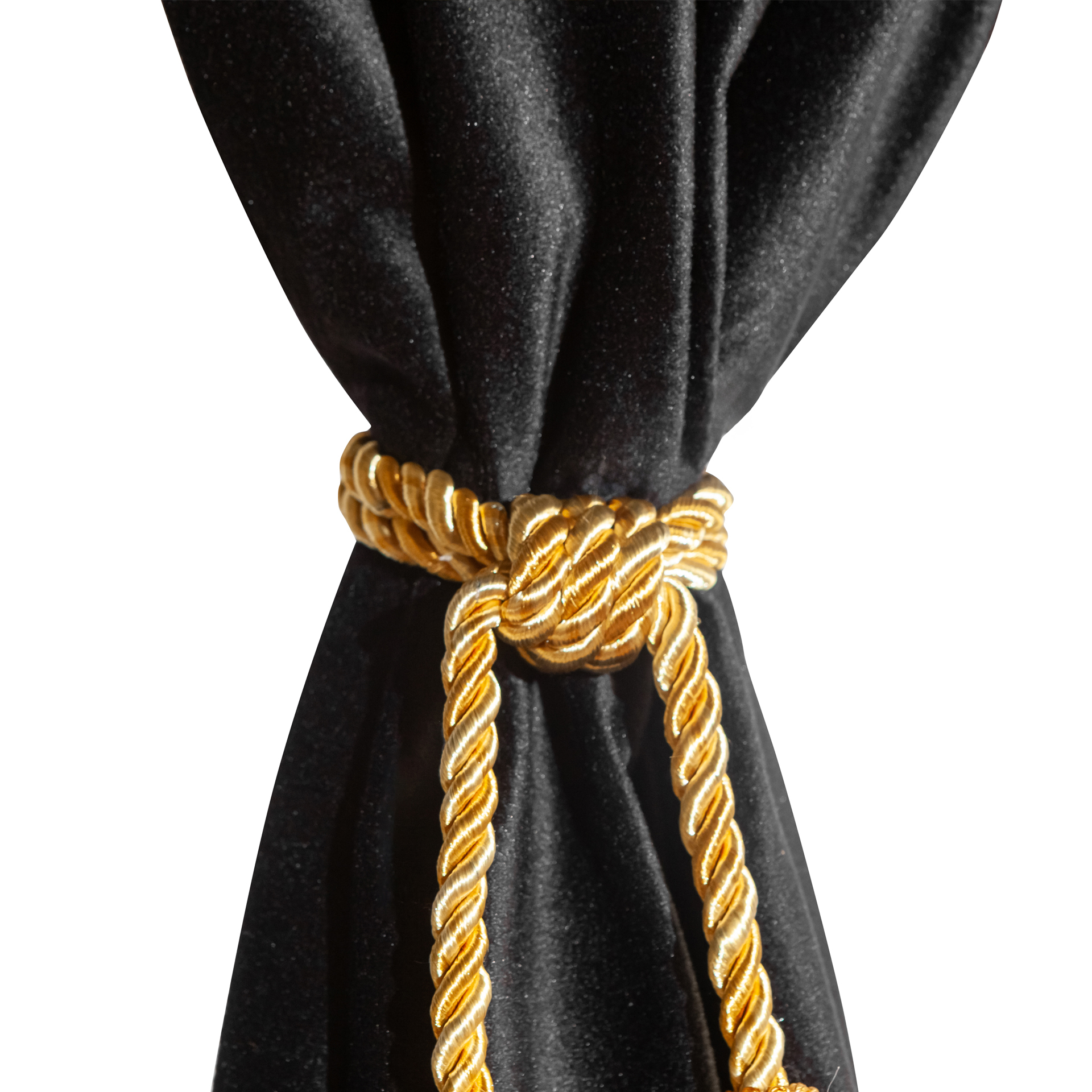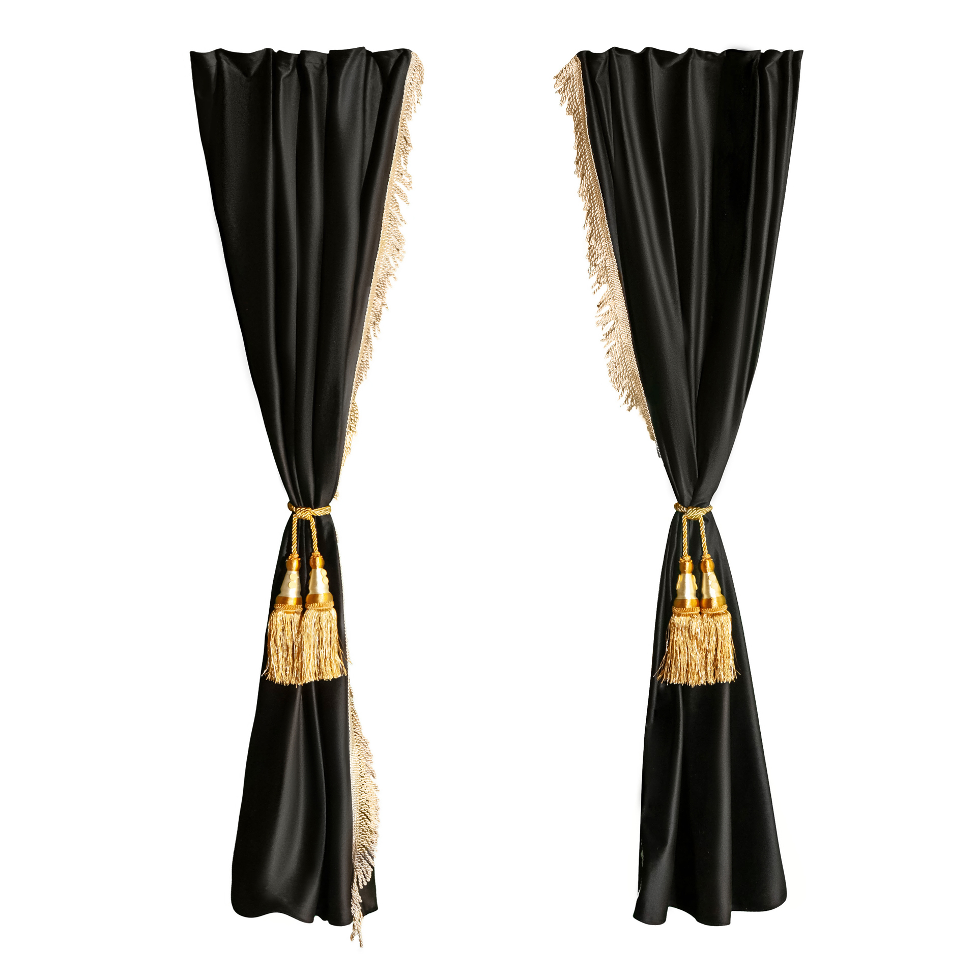 Изготовлены из качественного двойного велюра, шторы обладают свойствами блэкаут, что обеспечивает надежную защиту от солнечных лучей и лишних взглядов. Черный цвет с роскошной золотой бахромой придаёт вашим шторкам стильный и элегантный вид, отлично сочетаясь с любым интерьером.