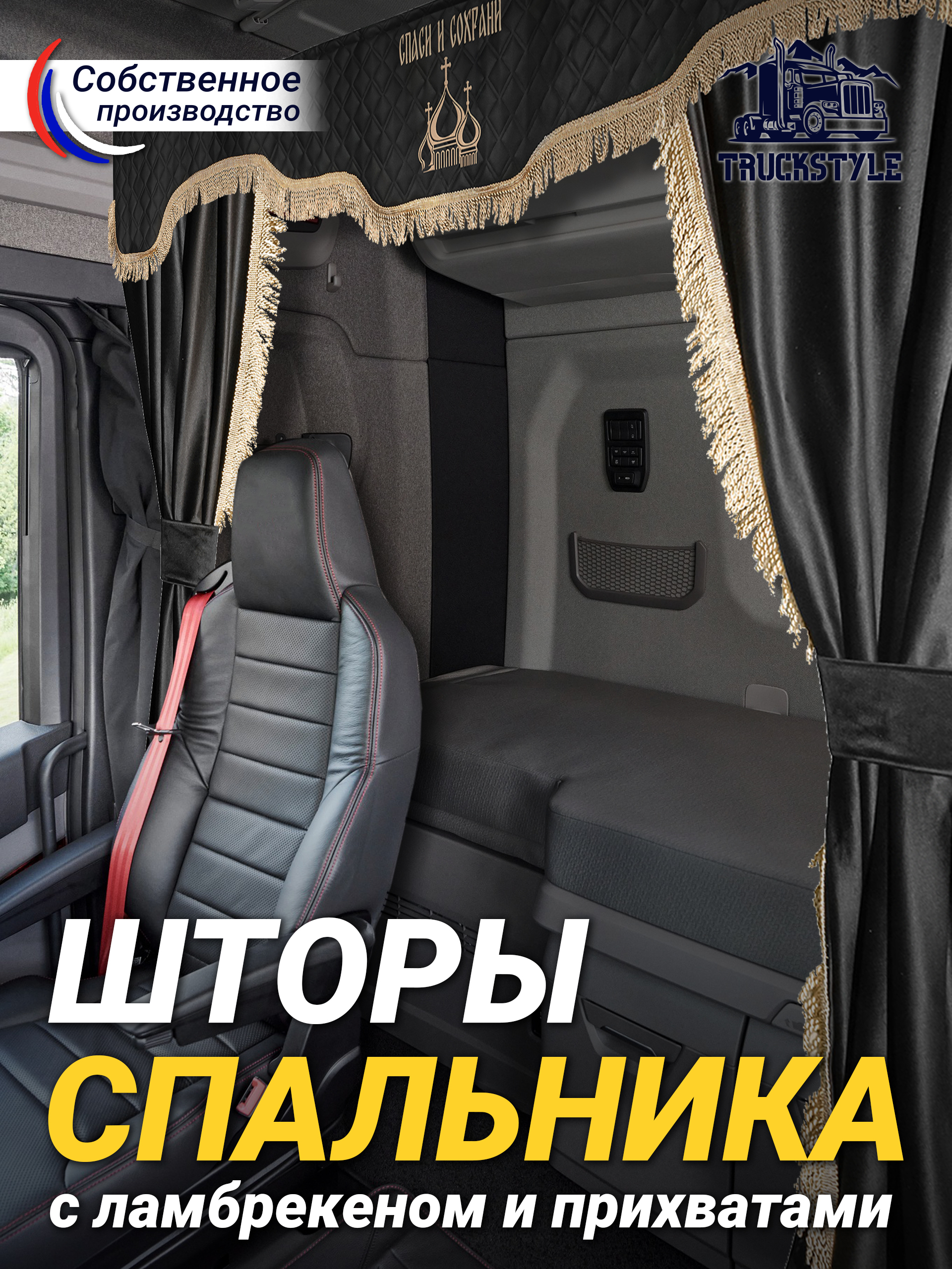 Шторы спального места с прихватами в кабину грузовика. Ламбрекен из экокожи с вышивкой Спаси и Сохрани и прихватами. Высота 1,5м, ширина одной стороны - 1,15м. Блэкаут, велюр. Черный цвет с бежевой бахромой