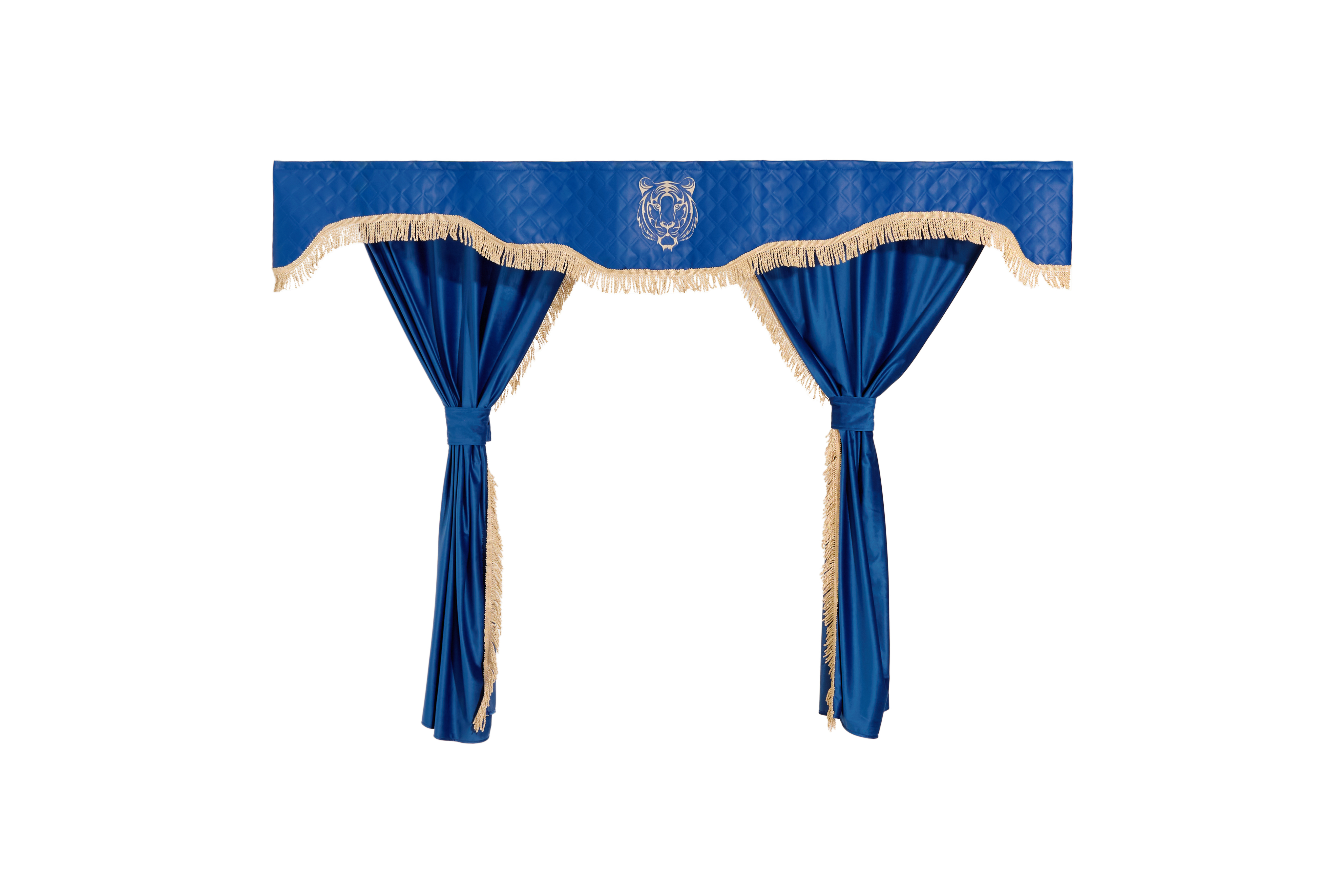 Шторы спального места с прихватами в кабину грузовика. Ламбрекен из экокожи с вышивкой Тигр и прихватами. Высота 1,5м, ширина одной стороны - 1,15м. Блэкаут, велюр. Синий цвет с бежевой бахромой