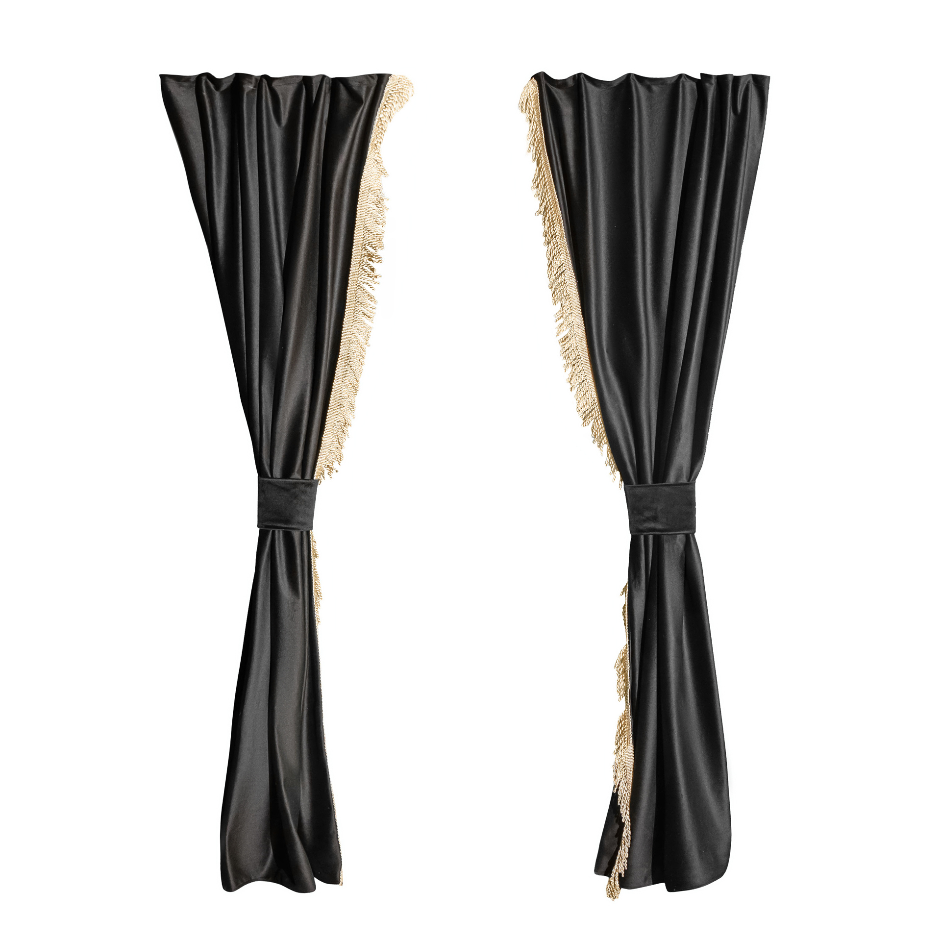 Изготовлены из качественного двойного велюра, шторы обладают свойствами блэкаут, что обеспечивает надежную защиту от солнечных лучей и лишних взглядов. Черный цвет с роскошной золотой бахромой придаёт вашим шторкам стильный и элегантный вид, отлично сочетаясь с любым интерьером.
