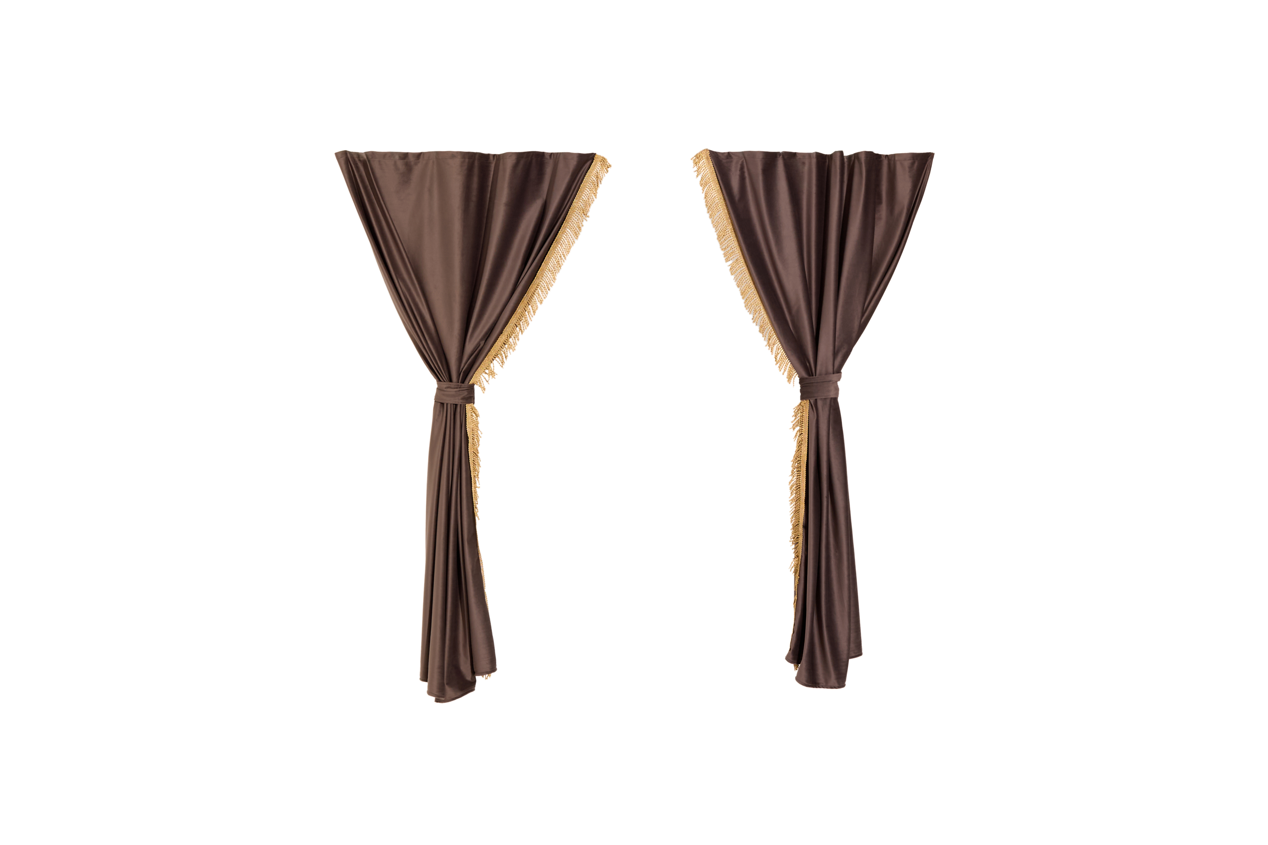 Шторы спального места с прихватами в кабину Volvo, Scania, MAN, DAF, Merc, Камаз, Sitrak, Shacman, Foton, FAW. Высота 1,5м, ширина одной стороны - 1,15м. Блэкаут, велюр. Кофейный цвет с бежевой бахромой