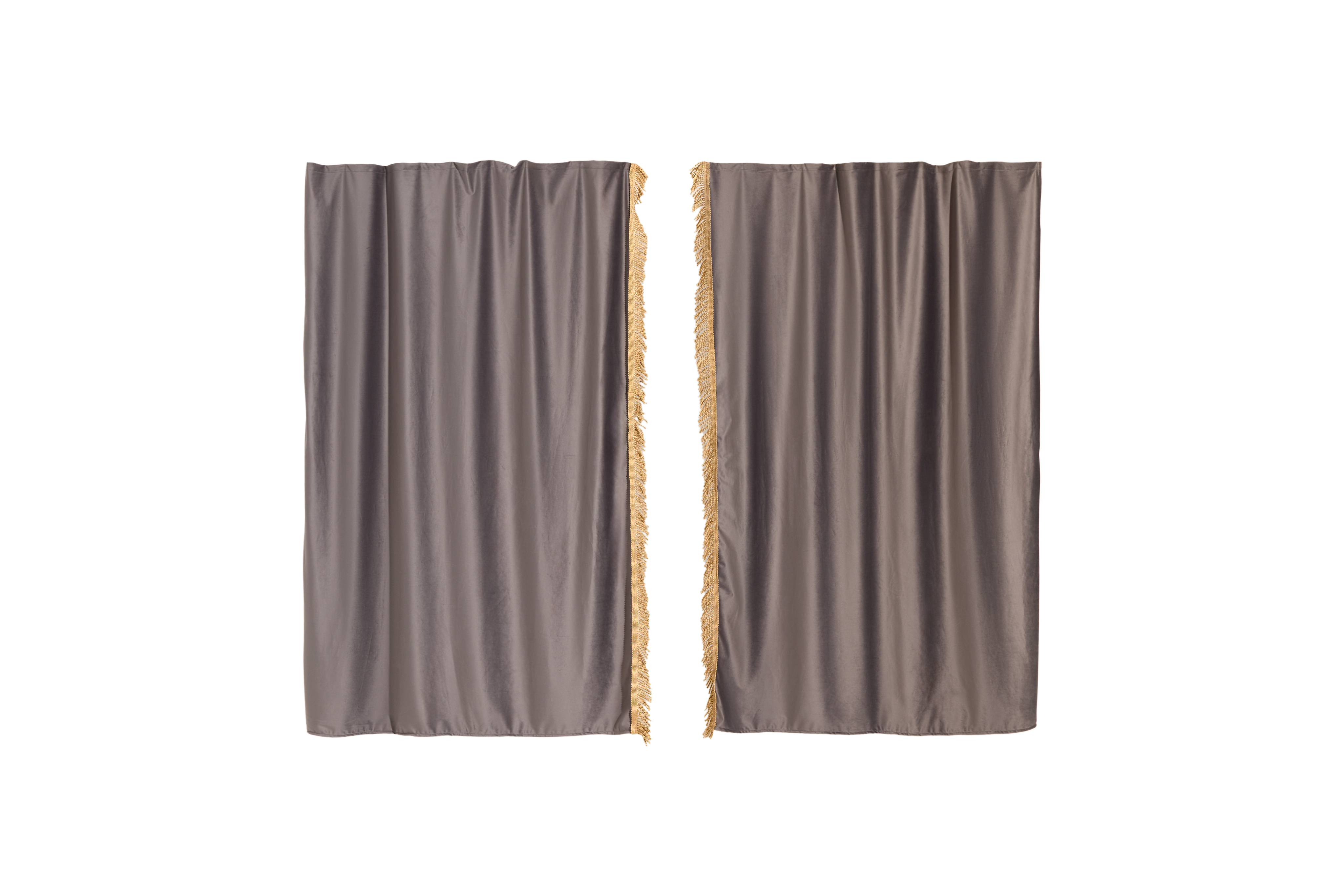 Шторы спального места в кабину Volvo, Scania, MAN, DAF, Merc, Камаз, Sitrak, Shacman, Foton, FAW. Высота 1,5м, ширина одной стороны - 1,15м. Блэкаут, велюр. Серый цвет с бежевой бахромой