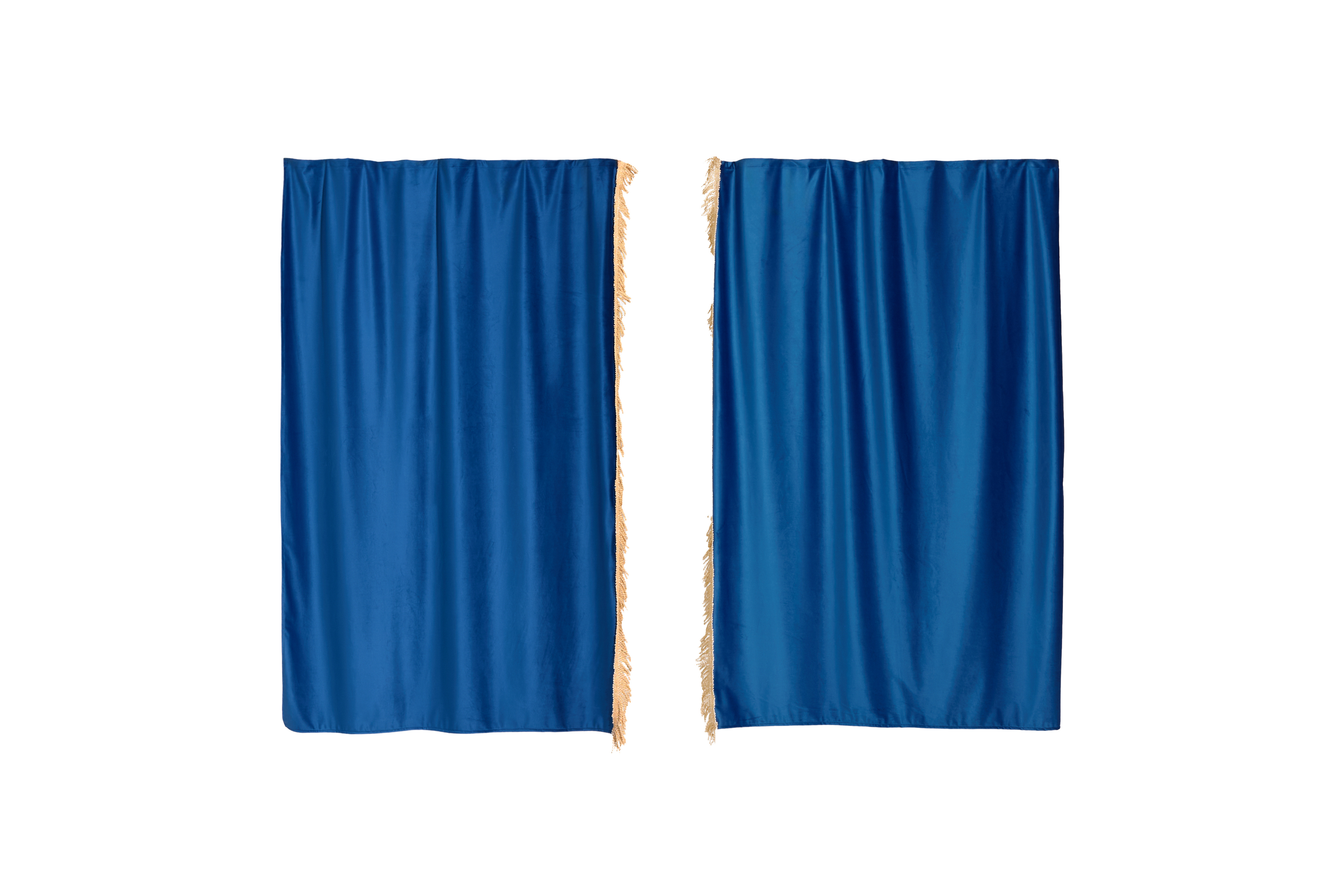 Шторы спального места в кабину Volvo, Scania, MAN, DAF, Merc, Камаз, Sitrak, Shacman, Foton, FAW. Высота 1,5м, ширина одной стороны - 1,15м. Блэкаут, велюр. Синий цвет с бежевой бахромой